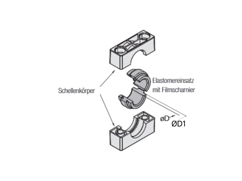 Anwendung: geeignet zur besonders geräusch- und vibrationsdämpfenden Befestigung von Rohren und besonders schonenden Befestigung von Schläuchen und Kabeln